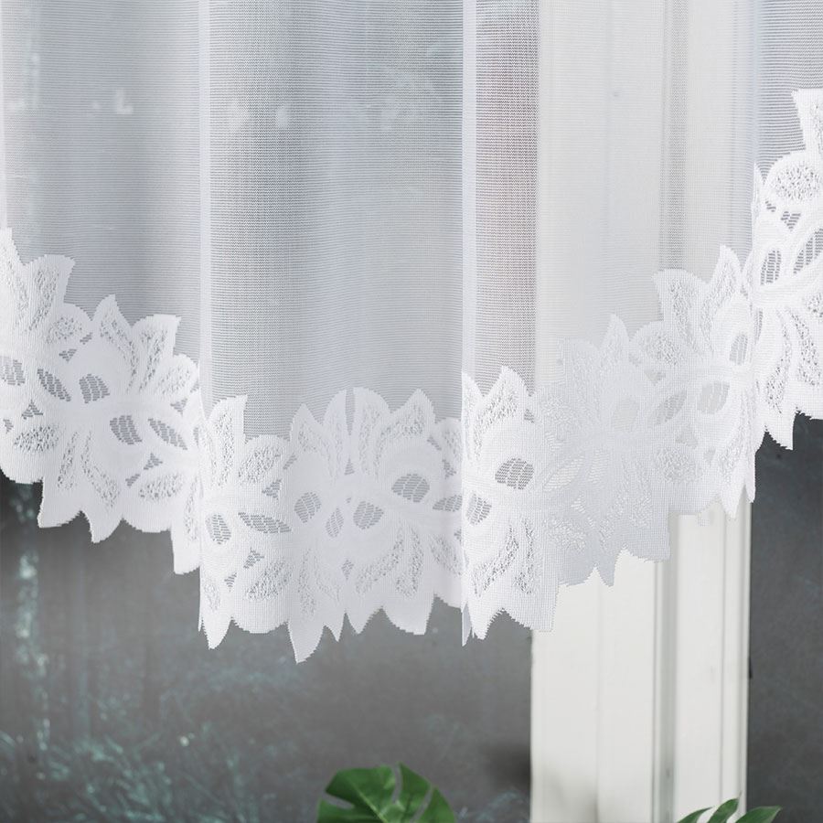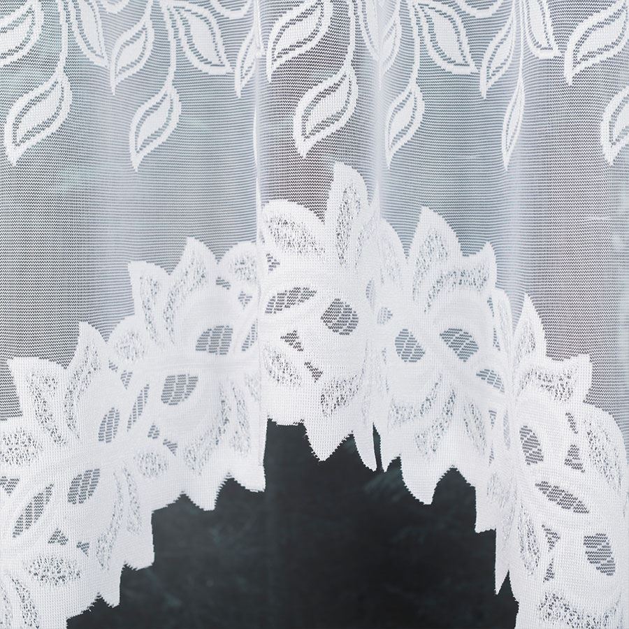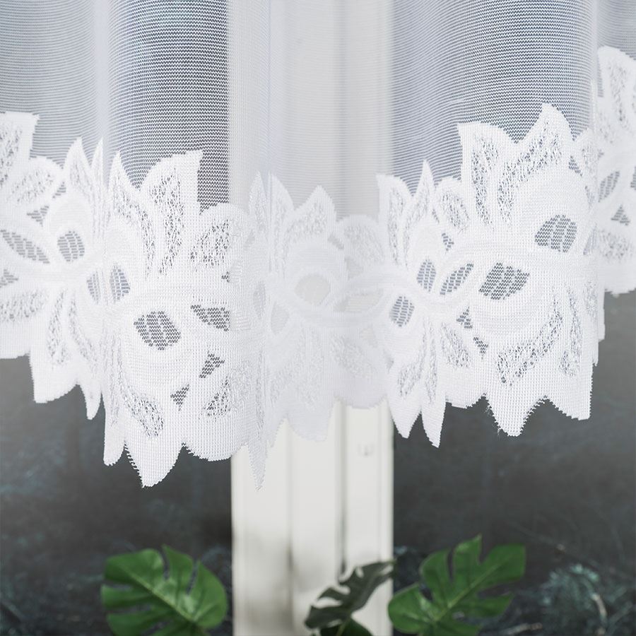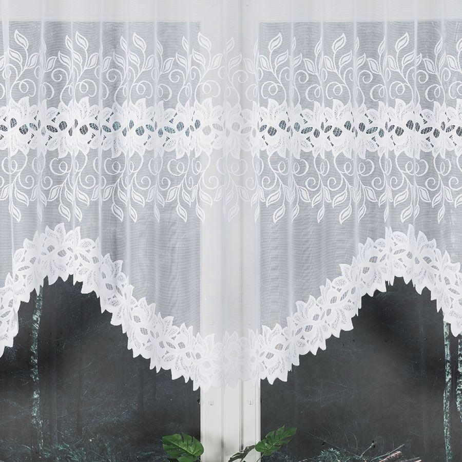 Firanka BASTIA 300×120 cm w kolorze białym to gotowa firana żakardowa o delikatnym wzorze, idealna do salonu, sypialni i jadalni.