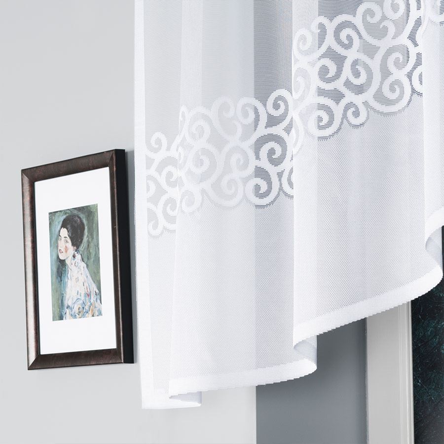 Gotowa firanka żakardowa DANIELA 250 x 90 cm w białym kolorze to praktyczna i elegancka dekoracja, idealna do kuchni, jadalni lub mniejszego okna w salonie.