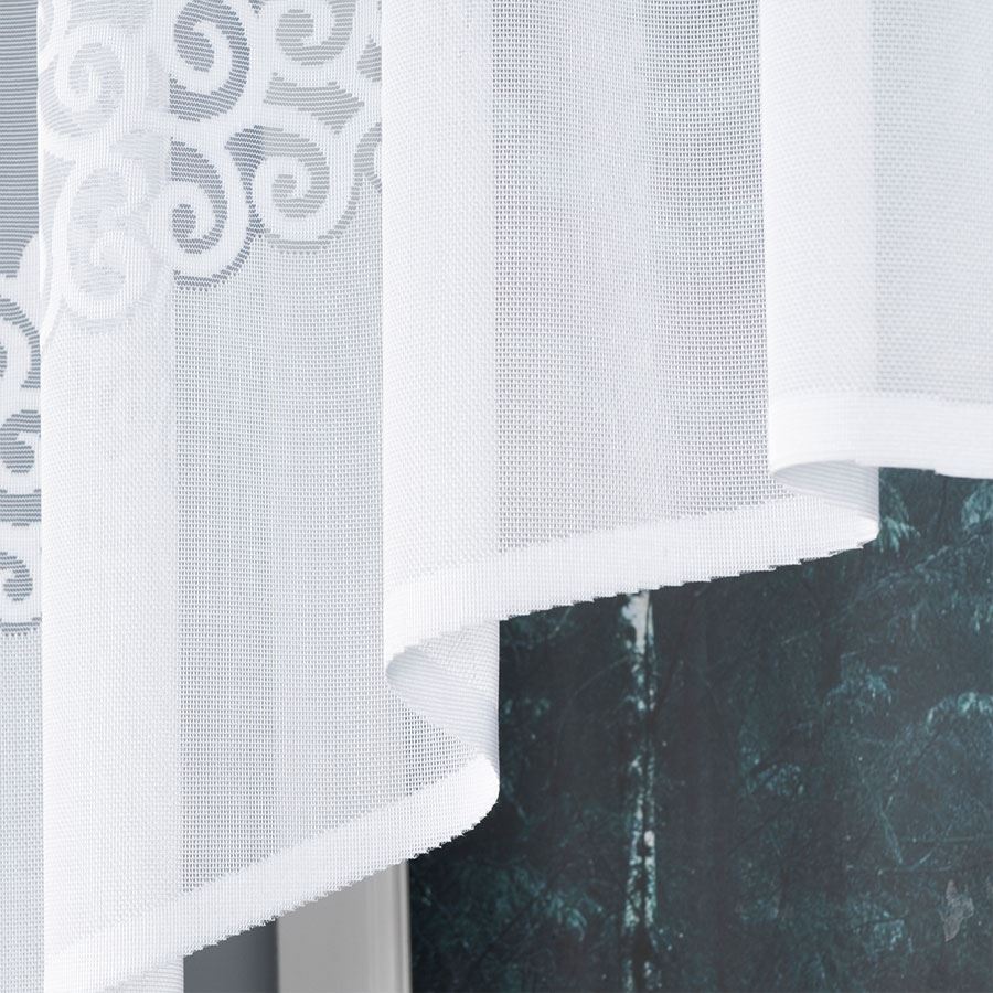 Model DANIELA to lekka firanka z delikatnego żakardu. Wersja o szerokości 250 cm i wysokości 90 cm świetnie sprawdzi się w kuchni, jadalni lub w pomieszczeniach z niższymi oknami. Biały kolor i subtelny wzór sprawiają, że firanka komponuje się z wieloma stylami wnętrz — od klasycznych po nowoczesne.
