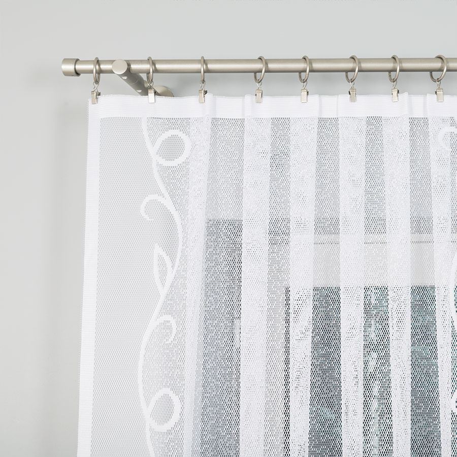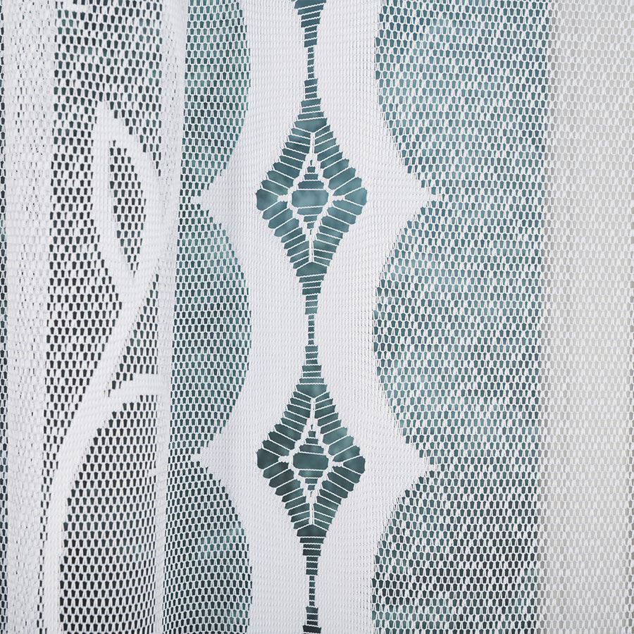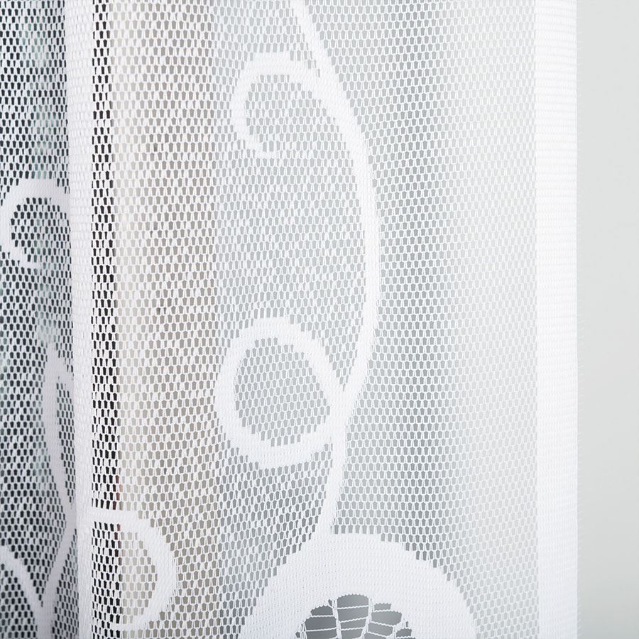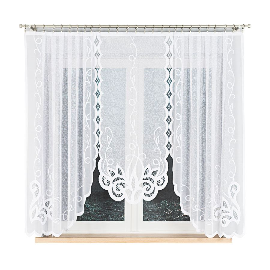 Firanka EWELINA z żakardu w kolorze białym to lekka i elegancka dekoracja okienna. Szeroki rozmiar i gęsty wzór sprawiają, że doskonale prezentuje się w większych pomieszczeniach, rozświetlając wnętrze.