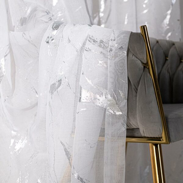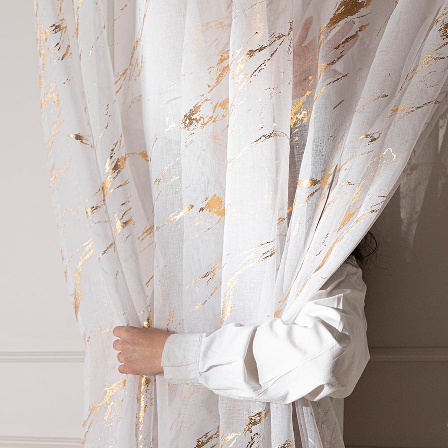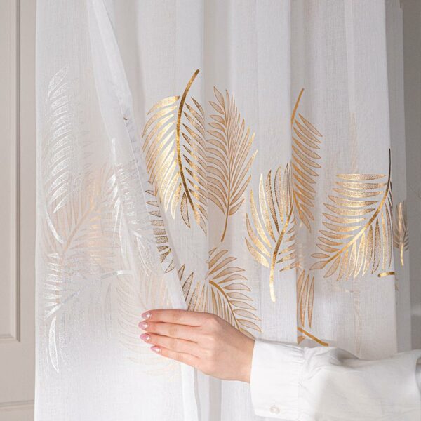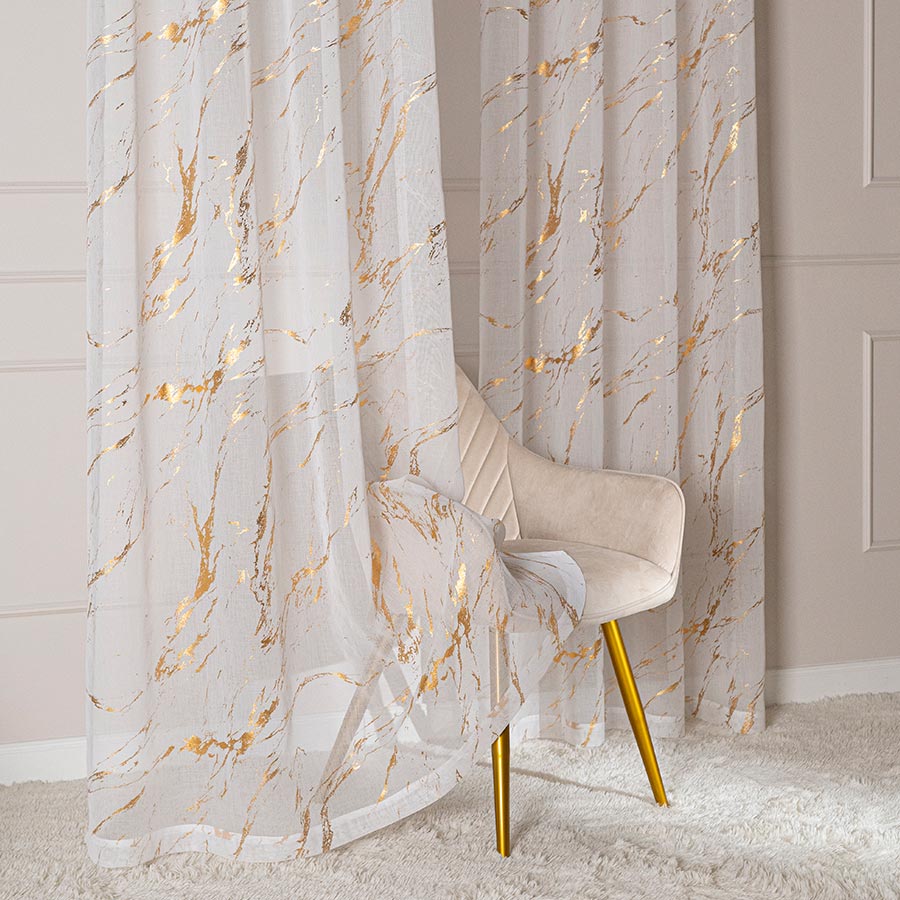 Firana MARMA o wymiarach 140×250 cm w kolorze białym ze złotym zdobieniem to gotowa firana na przelotkach z ołowianką. Idealna do salonu, sypialni czy jadalni.