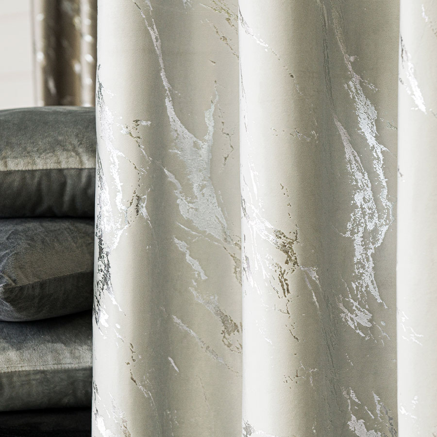 Welwetowy materiał dekoracyjny w kolorze szarym z jednostronnym srebrnym marmurowym nadrukiem to połączenie elegancji i nowoczesności.