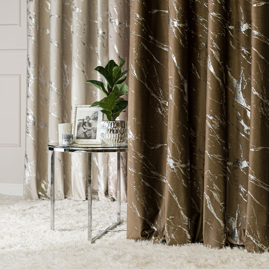 Zasłona gotowa MARMA na przelotkach o wymiarach 140 x 250 cm w brązowym kolorze ze srebrnym nadrukiem. Stylowa dekoracja z eleganckiej tkaniny VELVI, która dodaje wnętrzu ciepła.