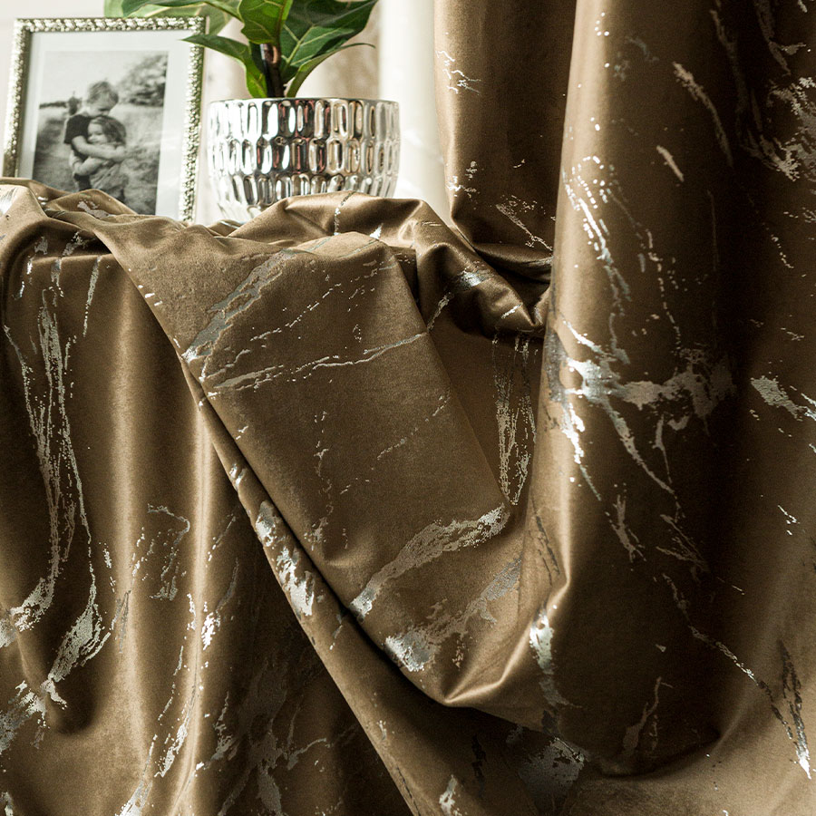 Zasłona MARMA wykonana z eleganckiej tkaniny VELVI w odcieniu brązowym to doskonały wybór dla wnętrz, które potrzebują ciepła. Srebrny nadruk dodaje całości nowoczesnego akcentu, a struktura welwetowa zapewnia efekt miękkości.