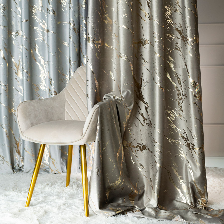 Zasłona MARMA wykonana z eleganckiej tkaniny VELVI w odcieniu szarobeżowym to doskonały wybór dla wnętrz, które potrzebują ciepła. Złoty nadruk dodaje całości nowoczesnego akcentu, a struktura welwetowa zapewnia efekt miękkości.