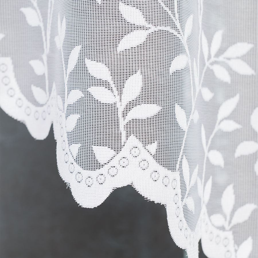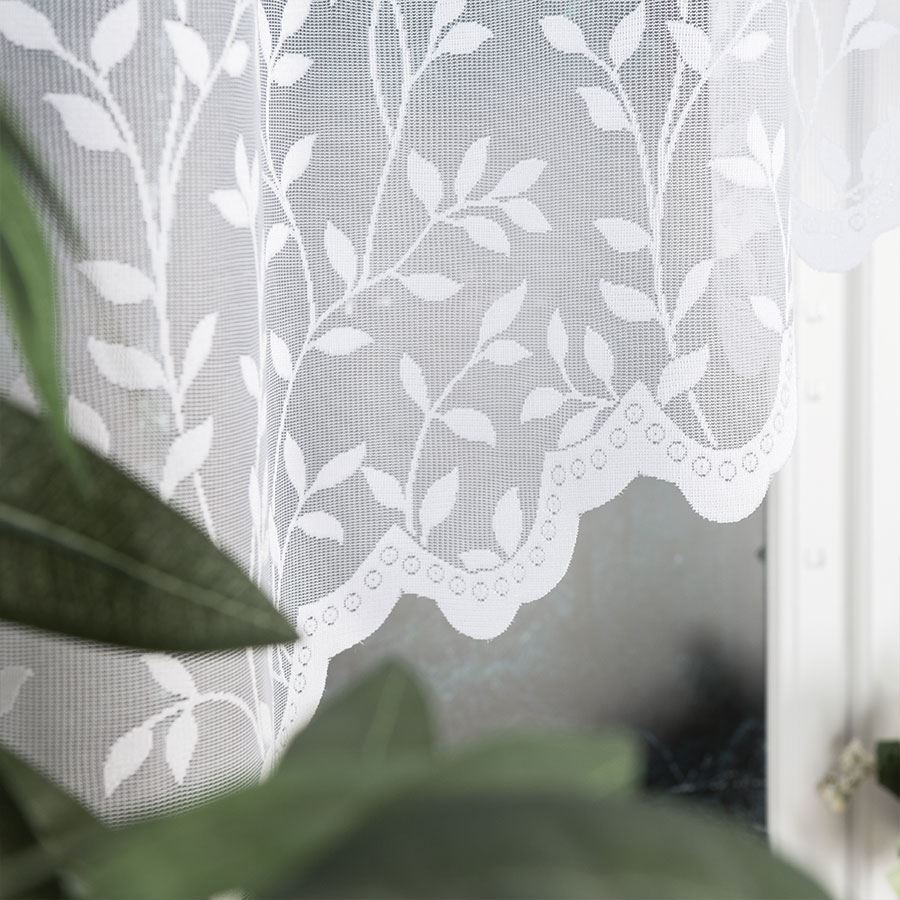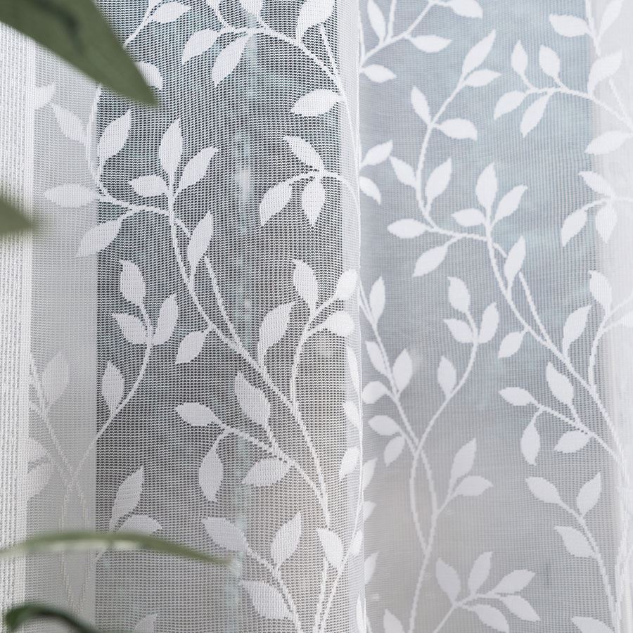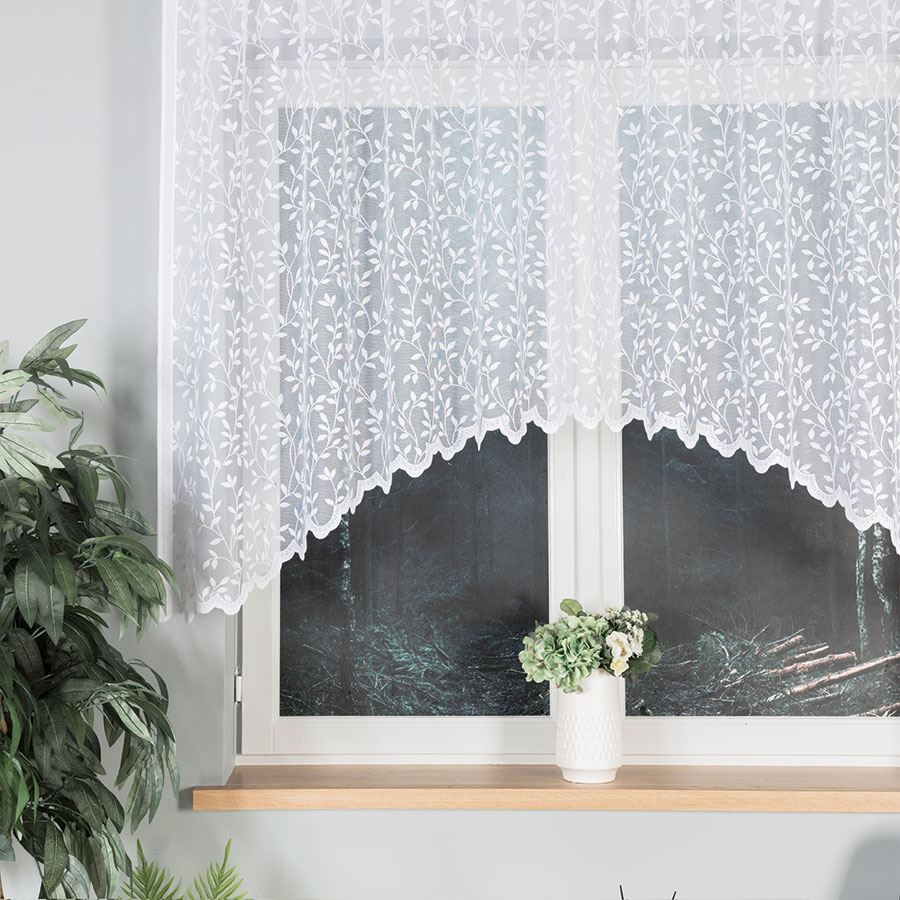 Firanka ZUZANNA 250×130 cm w białym kolorze to gotowa firanka żakardowa ze wzorem na całej powierzchni, idealna do kuchni, jadalni i mniejszych okien.