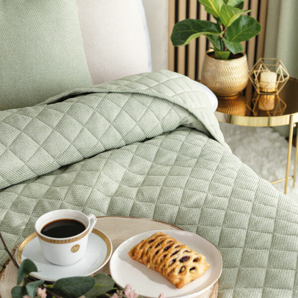 Narzuta MOLLY to elegancki i funkcjonalny dodatek do każdej sypialni. Jej subtelny design i delikatny kolor szałwiowy wprowadzą do wnętrza przytulną i harmonijną atmosferę, jednocześnie pięknie zdobiąc łóżko. Doskonała zarówno jako dekoracja, jak i ochrona pościeli przed kurzem i zabrudzeniami.