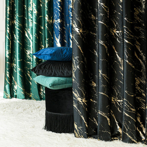 Zasłona gotowa MARMA na taśmie o wymiarach 140 x 250 cm w czarnym kolorze ze złotym nadrukiem. Stylowa dekoracja z eleganckiej tkaniny VELVI, która dodaje wnętrzu ciepła.