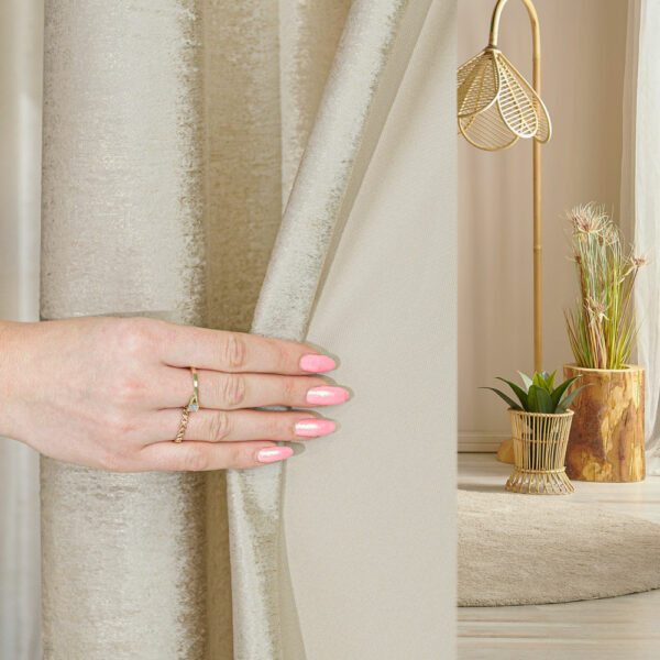 Zasłona gotowa MARMA na przelotkach o wymiarach 140 x 250 cm w jasnokremowym kolorze ze złotym nadrukiem. Stylowa dekoracja z eleganckiej tkaniny VELVI, która dodaje wnętrzu ciepła.