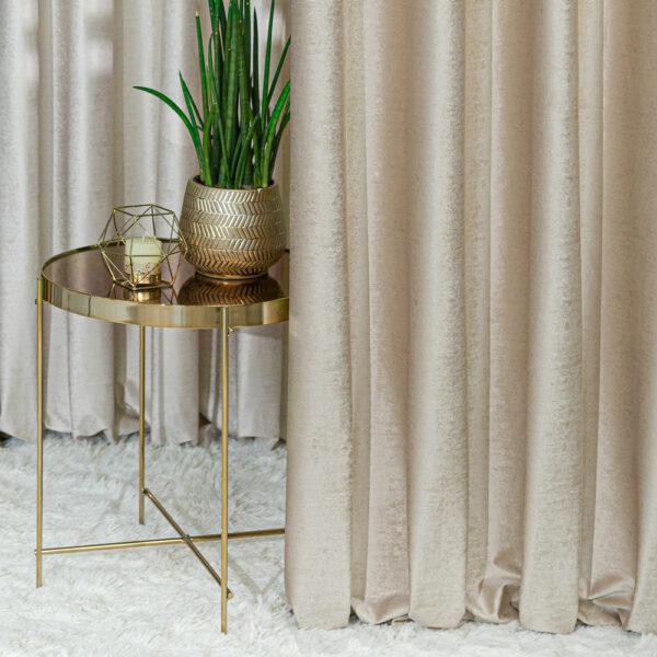Zasłona ELEONORA na przelotkach w kolorze ciemnobeżowym ze złotym nadrukiem na miękkiej welwetowej tkaninie VELVI. Elegancka i ponadczasowa dekoracja do wnętrz.