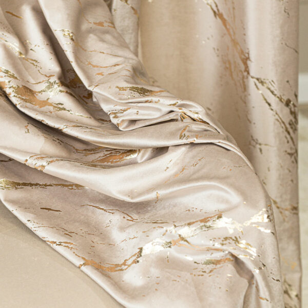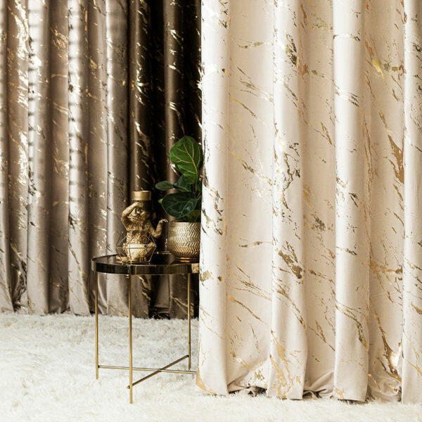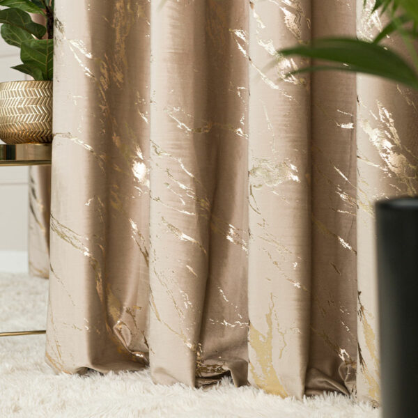 Zasłona gotowa MARMA na przelotkach o wymiarach 140 x 250 cm w ciemnobeżowym kolorze ze złotym nadrukiem. Stylowa dekoracja z eleganckiej tkaniny VELVI, która dodaje wnętrzu ciepła.