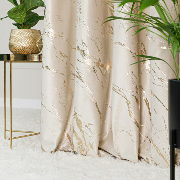 Zasłona gotowa MARMA na taśmie o wymiarach 140 x 250 cm w kremowym kolorze ze złotym nadrukiem. Stylowa dekoracja z eleganckiej tkaniny VELVI, która dodaje wnętrzu ciepła.