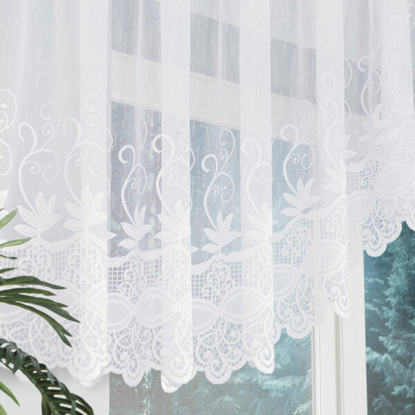 Firanka CELINA 300×160 cm w białym kolorze to gotowa firanka żakardowa z dekoracyjnym wzorem, idealna do salonu, sypialni lub jadalni.