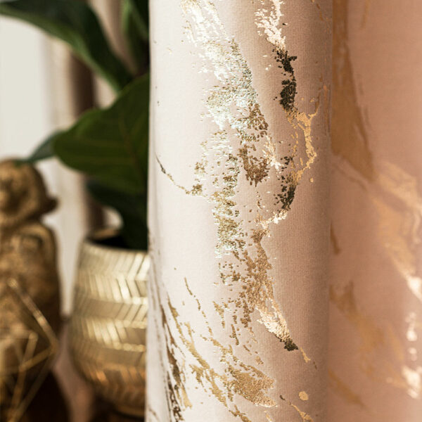 Zasłona gotowa MARMA na przelotkach o wymiarach 140 x 250 cm w jasnobeżowym kolorze ze złotym nadrukiem. Stylowa dekoracja z eleganckiej tkaniny VELVI, która dodaje wnętrzu ciepła.