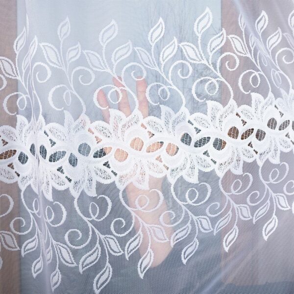 Firanka FELICJA 300×160 cm w białym kolorze to gotowa żakardowa firanka z ozdobnym wzorem na dole, idealna do salonu, sypialni i jadalni.