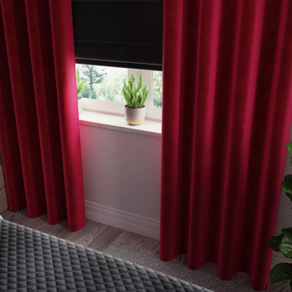 Zasłona gotowa VELVI w czerwonym odcieniu to stylowa dekoracja, która wprowadza do wnętrza przytulność. Przelotki umożliwiają łatwe zawieszenie oraz efektowne ułożenie tkaniny.